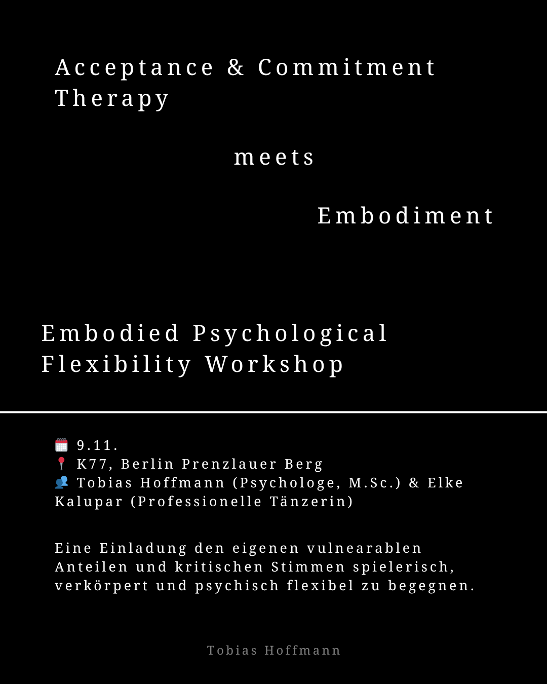 Ich, Tobi, Psychologe (M. Sc.) und angehender systemischer Therapeut lade gemeinsam mit der Tänzerin Elke Kalupar dazu ein, den eigenen vulnerablen Anteilen und kritischen Stimmen spielerisch, verkörpert und psychisch flexibel zu begegnen. Mit diesem Workshop und Erfahrungsraum verbinde ich gleich mehrere meiner Passionen: ACT, Anteilarbeit, Bewegung, Tanz und Theater. ------------------------------------------------------------------------- Oft treiben uns innere Stimmen […]